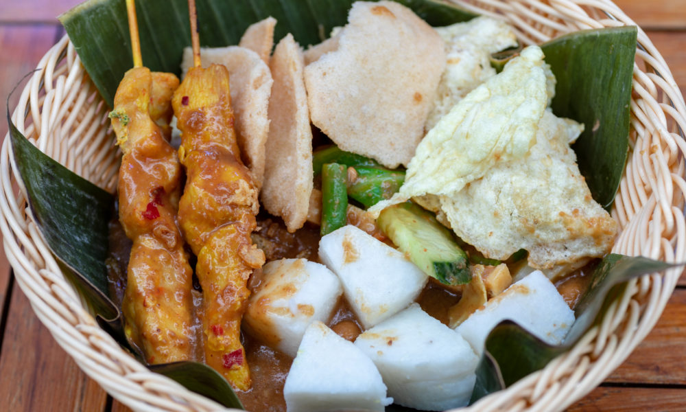 240. | Maleisie Saté (4 st. / pcs) Speciaal gemarineerde kipsaté met pindasaus, komkommer, kroepoek en lontong Special marinated grilled chicken satay with peanut butter sauce, cucumber, prawn crackers and compressed rice cakes |